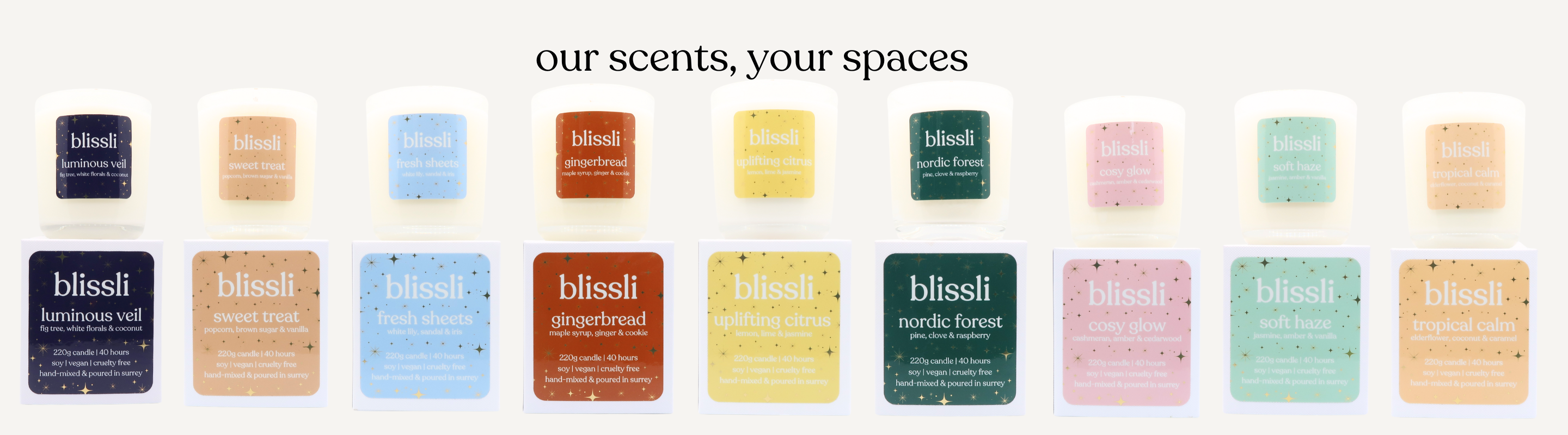 we take scent seriously (ourselves, not so much). at blissli, our vegan soy candles are hand-poured in small batches and designed to turn your home into your happy place.