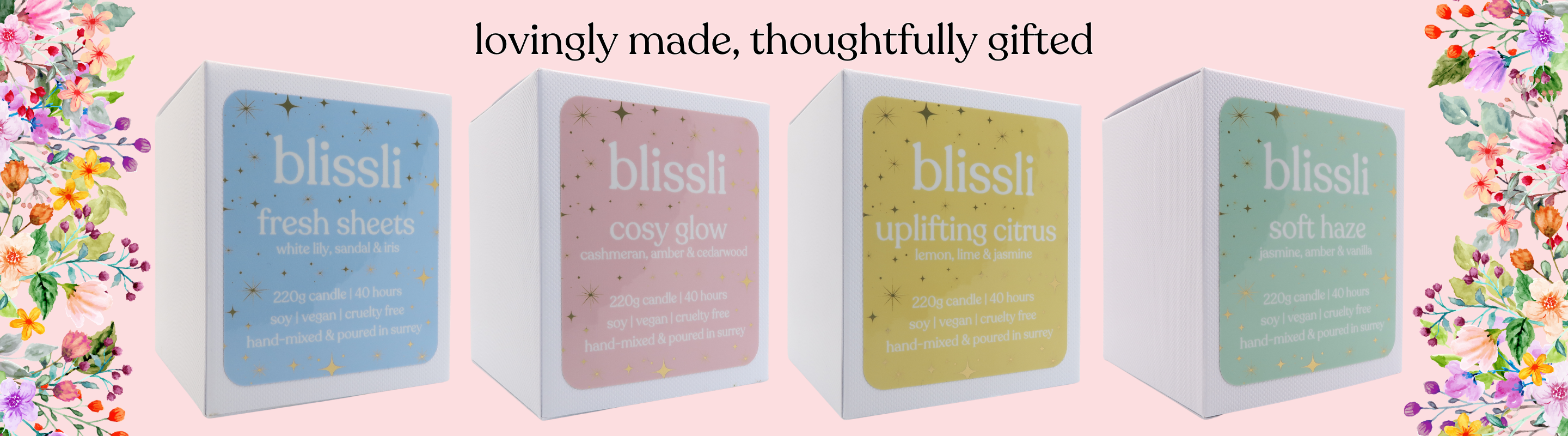 we take scent seriously. at blissli, our vegan soy candles are hand-poured in small batches and designed to turn your home into your happy place.